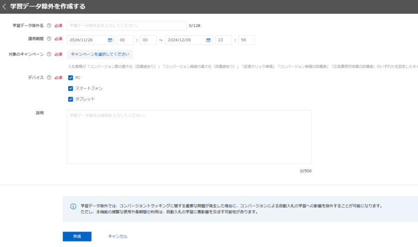 必要事項入力の上、作成で自動入札の学習データ除外の設定が完了です。