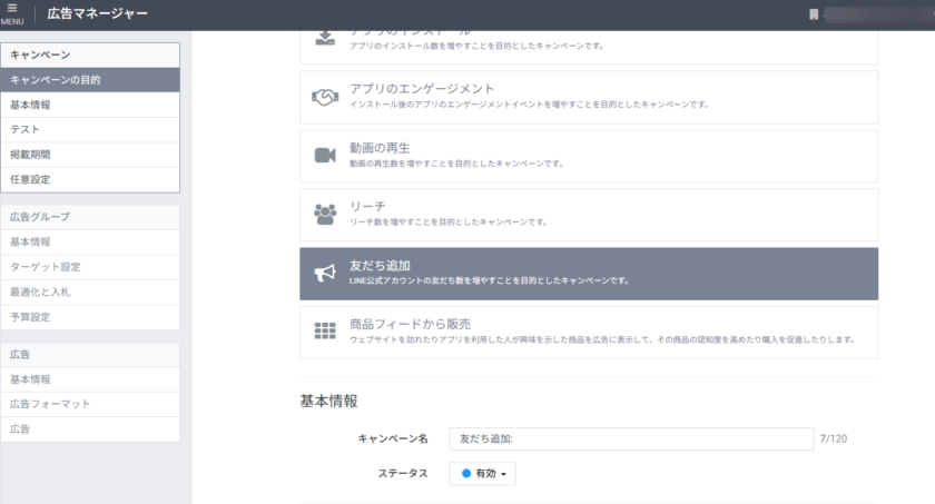 このとき、広告配信の目的として「友だち追加」を選択することで、LINE公式アカウントへの友だち数を計測・最適化する配信が可能になります。