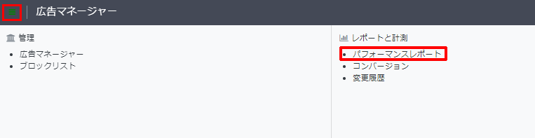 広告管理画面の左上のメニューをクリックして、レポートと計測の「パフォーマンスレポート」を選択します。