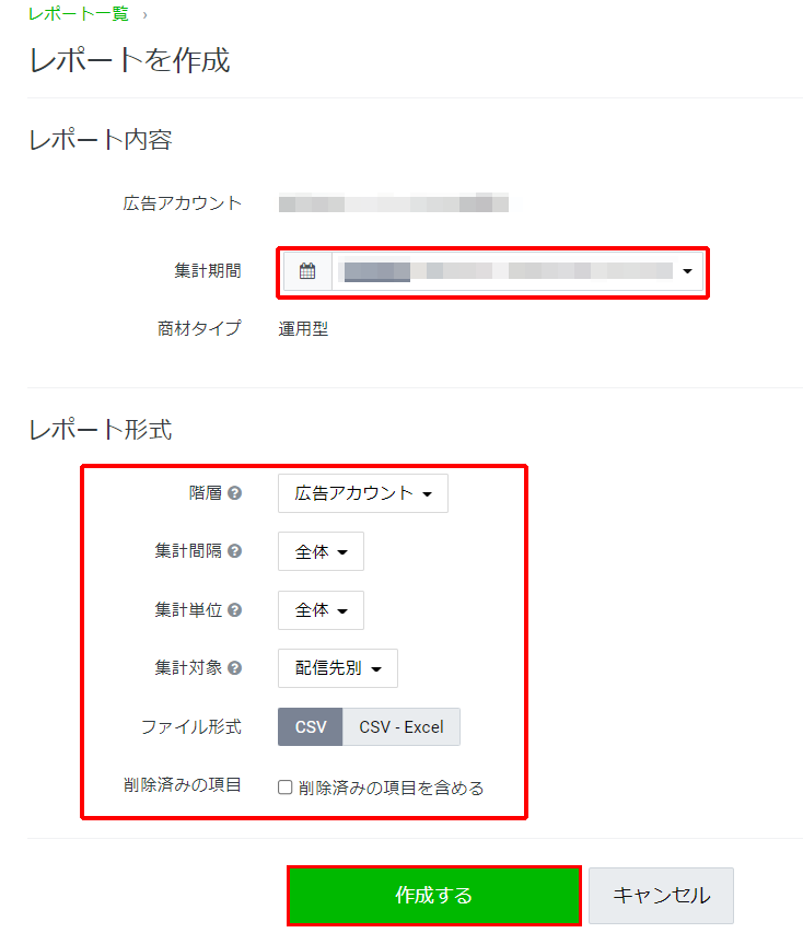 「集計期間」を入力し、集計対象の「階層」「集計間隔」「集計単位」を任意選択します。「集計対象」で「配信先別」を選択して「作成する」をクリックで配信先別のパフォーマンスレポートを出力できます。