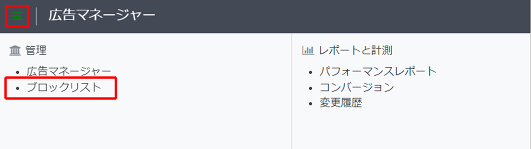 LINE広告マネージャーのメニューをクリックして、管理の「ブロックリスト」を選択します。