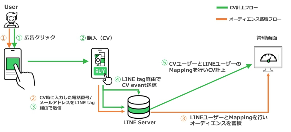 Advanced matchingとは、LINE Tag を通してハッシュ化された1st party data(電話番号/メールアドレス)をLINEに送ることで、配信の最適化やコンバージョン計測精度の向上と、オーディエンス蓄積を増加させる機能です。