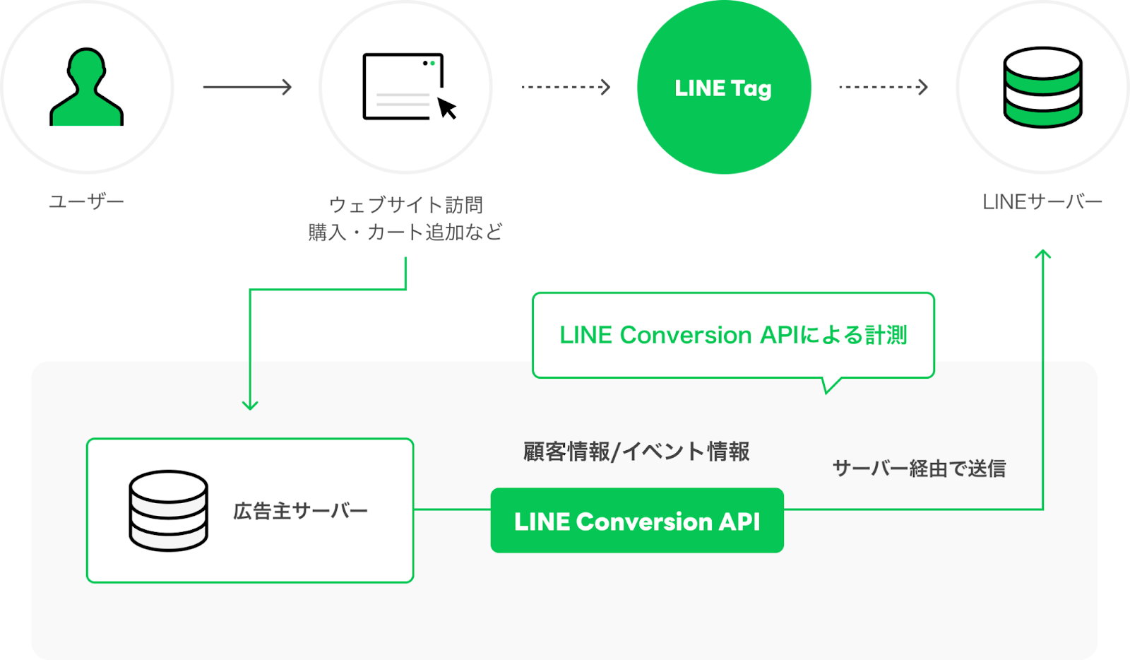 これまでの「LINE Tag」を通じたデータ取得のみならず、広告主側のサーバーで保有しているユーザーデータ*3を、広告主のサーバー経由で直接LINEに送信することが可能になるため、LINEの運用型プラットフォーム「LINE広告」のコンバージョン計測や最適化の精度向上が期待できます。