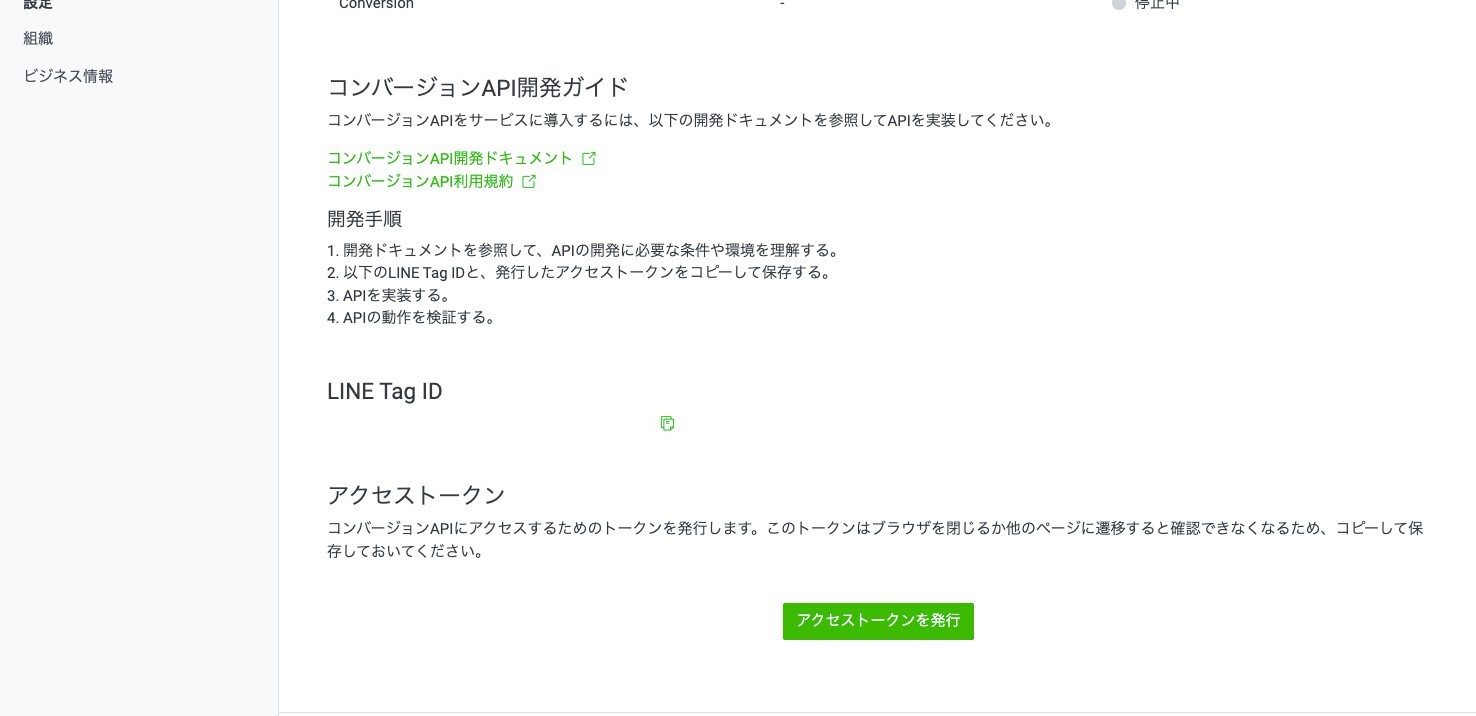 同意が完了するとコンバージョンAPIのトークン発行や管理が可能になります。