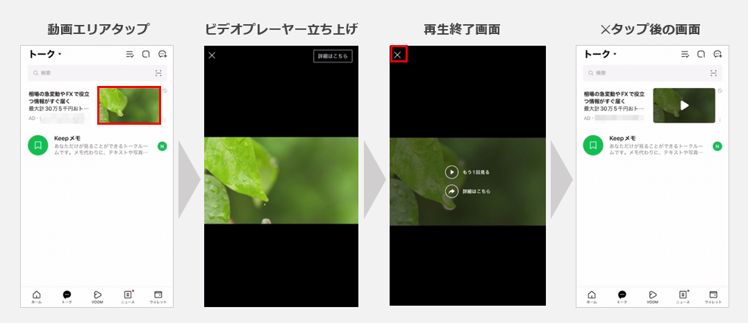トークリストを開いた状態でも動画は再生されていますが、動画のエリアをタップすることでビデオプレーヤーが立ち上がり、大きな画面で動画を視聴できます。視聴後はもう一度見るかサイト遷移を選択でき、×をタップすると元の画面に戻る仕様です。ビデオプレーヤーが立ち上がると画面には動画だけが投影されるため、しっかりと広告を見てもらえるのは嬉しいですね。