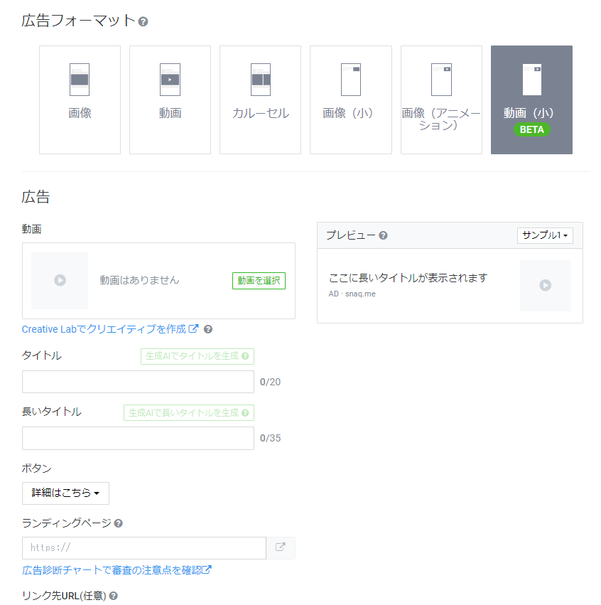 広告フォーマットから動画(小)を選択し、動画を追加します。