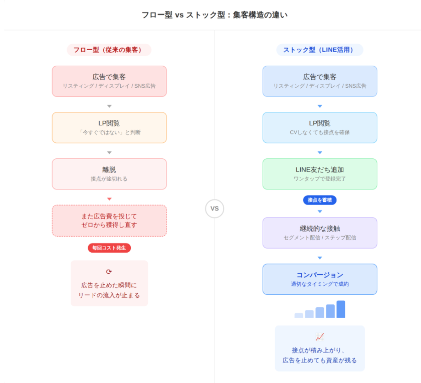 LINE公式アカウントを活用したストック型マーケティングの本質は、一度接点を持ったユーザーとの関係を切らさず、信頼を積み上げながら適切なタイミングでコンバージョンにつなげるという設計にあります。広告費を投じるたびにゼロからやり直すのではなく、積み上がっていく資産としてリードをプールしていく考え方です。