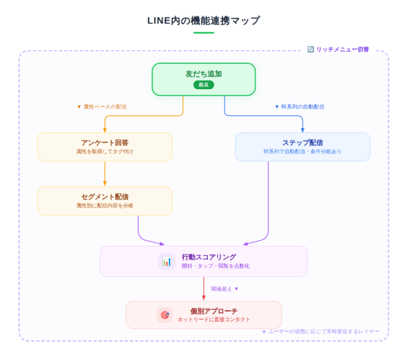 ここでLステップやL Message、Linyといった拡張ツールを導入すると、MA(マーケティングオートメーション)やCRMに近い運用が可能になります。以下、主な機能を見ていきます。