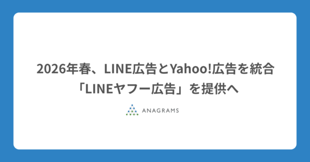 <blockquote class="wp-embedded-content" data-secret="dja90ciB5S"><a href="https://anagrams.jp/blog/line-yahoo-unified-ads-platform-2026/">2026年春、LINE広告とYahoo!広告を統合「LINEヤフー広告」を提供へ</a></blockquote><iframe sandbox="allow-scripts" security="restricted" src="https://anagrams.jp/blog/line-yahoo-unified-ads-platform-2026/embed/#?secret=dja90ciB5S" width="600" height="400" title="“2026年春、LINE広告とYahoo!広告を統合「LINEヤフー広告」を提供へ” — アナグラム株式会社" data-secret="dja90ciB5S" frameborder="0" marginwidth="0" marginheight="0" scrolling="no" class="wp-embedded-content"></iframe><script type="text/javascript"> /* <![CDATA[ */ /*! This file is auto-generated */ !function(d,l){"use strict";l.querySelector&&d.addEventListener&&"undefined"!=typeof URL&&(d.wp=d.wp||{},d.wp.receiveEmbedMessage||(d.wp.receiveEmbedMessage=function(e){var t=e.data;if((t||t.secret||t.message||t.value)&&!/[^a-zA-Z0-9]/.test(t.secret)){for(var s,r,n,a=l.querySelectorAll('iframe[data-secret="'+t.secret+'"]'),o=l.querySelectorAll('blockquote[data-secret="'+t.secret+'"]'),c=new RegExp("^https?:$","i"),i=0;i<o.length;i++)o[i].style.display="none";for(i=0;i<a.length;i++)s=a[i],e.source===s.contentWindow&&(s.removeAttribute("style"),"height"===t.message?(1e3<(r=parseInt(t.value,10))?r=1e3:~~r<200&&(r=200),s.height=r):"link"===t.message&&(r=new URL(s.getAttribute("src")),n=new URL(t.value),c.test(n.protocol))&&n.host===r.host&&l.activeElement===s&&(d.top.location.href=t.value))}},d.addEventListener("message",d.wp.receiveEmbedMessage,!1),l.addEventListener("DOMContentLoaded",function(){for(var e,t,s=l.querySelectorAll("iframe.wp-embedded-content"),r=0;r<s.length;r++)(t=(e=s[r]).getAttribute("data-secret"))||(t=Math.random().toString(36).substring(2,12),e.src+="#?secret="+t,e.setAttribute("data-secret",t)),e.contentWindow.postMessage({message:"ready",secret:t},"*")},!1)))}(window,document); /* ]]> */ </script>
