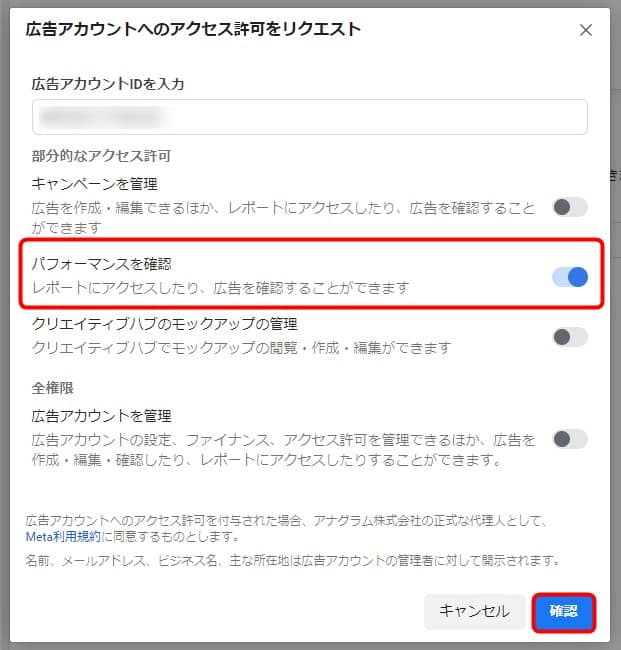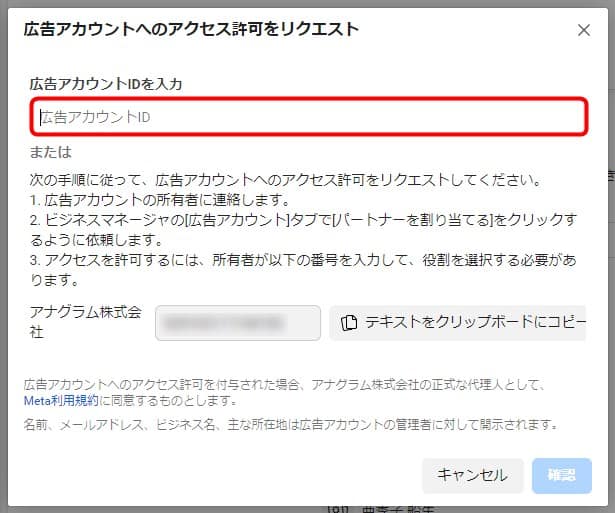 広告アカウントの分析などで、一時的に他社の広告アカウントにアクセスしたい場合はこの方法で連携します。