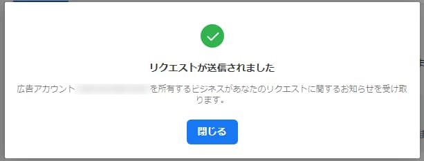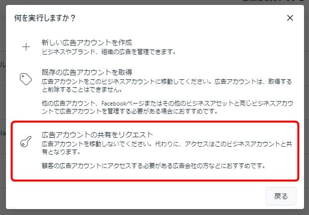 ⑤「広告アカウントの共有をリクエスト」をクリックします。
