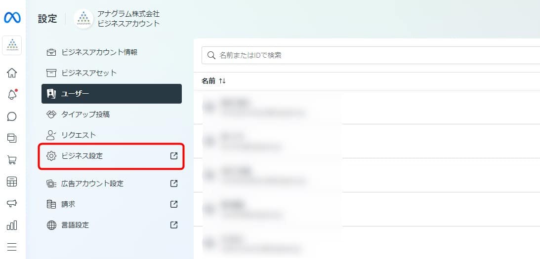 ①Meta Business Suiteを開き、画面左のサイドバーで「設定」をクリックします。