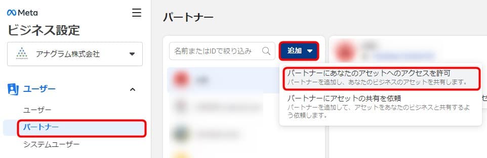 ③「パートナー」を選択して「追加」をクリックし、「パートナーにあなたのアセットへのアクセスを許可」を選択します。