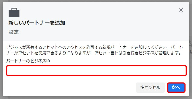 ④「パートナーのビジネスID」に広告代理店のMetaビジネスIDを入力して「次へ」を押して設定完了です。広告主と広告代理店のMeta Business Suiteの連携ができました。