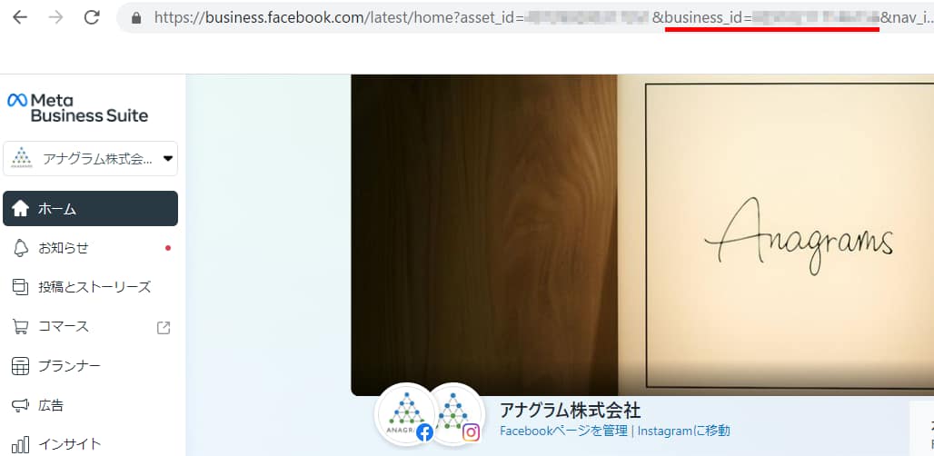 「MetaビジネスID」は、Meta Business Suiteにログイン時のURLで確認できます。