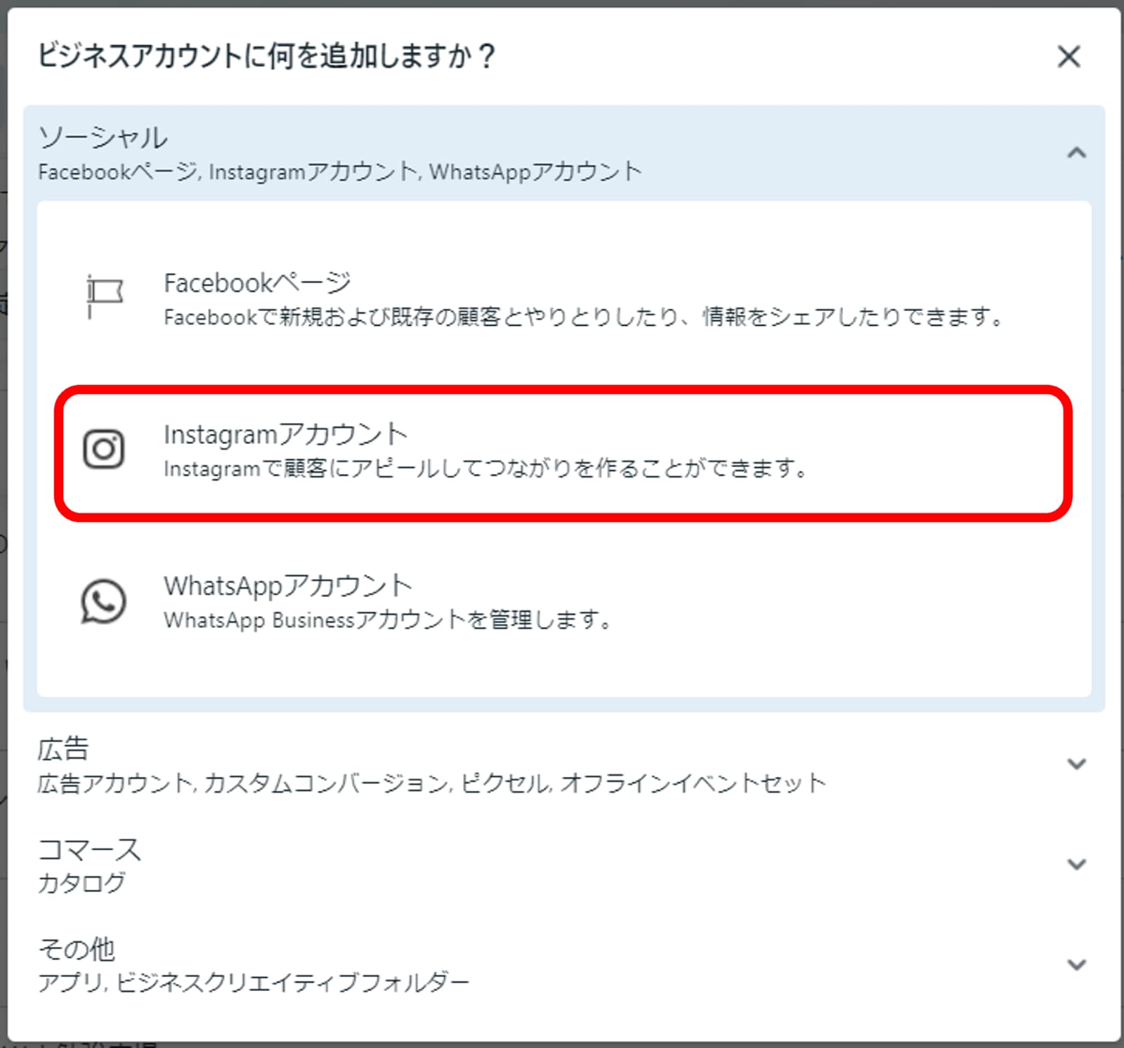 参考:Meta Business SuiteデスクトップでInstagramアカウントをビジネスアカウントにリンクする | Metaビジネスヘルプセンター