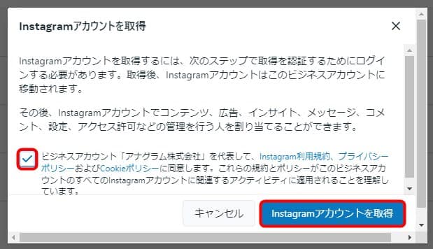 ⑤Instagram利用規約、プライバシーポリシーおよびCookieポリシーの同意にチェックを入れて許諾し、「Instagramアカウントを取得」をクリックします。