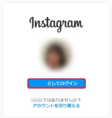 すでにInstagramにログインしている場合は、「〇〇(※)としてログイン」をクリックします。別のInstagramアカウントを連携したい場合は、「アカウントを切り替える」をクリックして再ログインします。