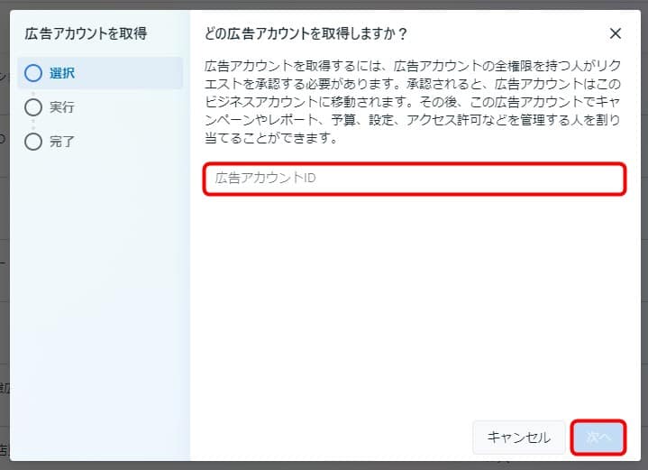 ⑥広告アカウントIDを入力し、「次へ」をクリックします。