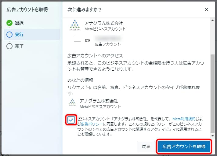 ⑦Meta利用規約および広告ポリシーの同意にチェックを入れて許諾し、「広告アカウントを取得」をクリックで設定完了です。自社の広告アカウントをMeta Business Suiteに連携できました。