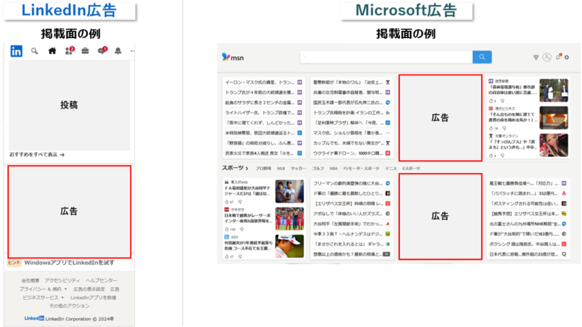 LinkedIn広告は、LinkedIn上での行動をもとにターゲティングし、LinkedIn内で広告を表示します。一方、Microsoft広告は、LinkedInのユーザーデータを活用しながら、Microsoft社のさまざまなプロパティに広告を配信できるのが特徴です。