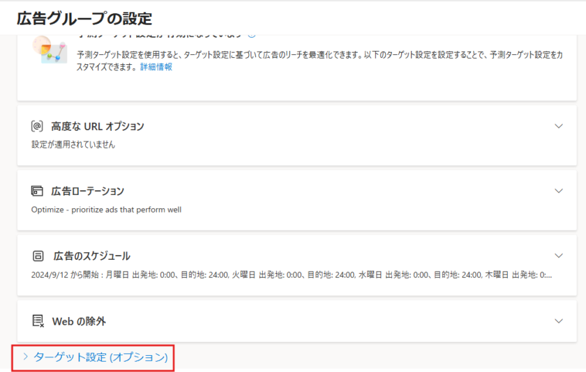 広告グループの設定画面をスクロールし、「ターゲット設定(オプション)」をクリックします。