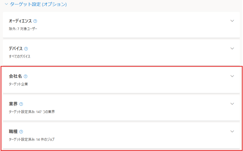 ※現在、公式ヘルプでは「LinkedIn プロファイルのターゲット設定は、米国、CA、英国、AU、FR、DE の各市場を対象とするキャンペーンでのみ使用できます。」となっていますが、日本国内の管理画面でも問題なく利用できる状態です。(日本国内でも正式に利用可能だと、Microsoft社へ問い合わせし確認済み)