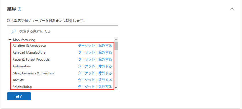 ターゲットや除外を選択したのちに「完了」をクリックします。