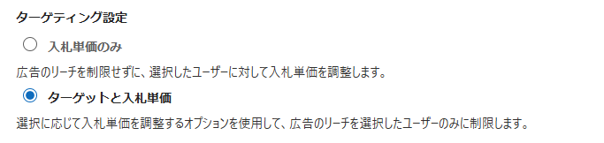 次はターゲティング設定ですが、キャンペーンによって選べる項目が異なるので注意が必要です。オーディエンス広告の場合、「入札単価のみ」「ターゲットと入札単価」の選択肢があるのに対し、それ以外のキャンペーンタイプでは、「入札単価のみ」が自動的に選択され「ターゲティングと入札単価のみ」は選ぶことはできません。