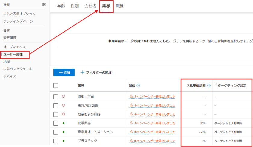 例えば、上記のキャプチャでは、「業界」から設定した「化学薬品」の入札単価を40%としているため、他の入札単価を設定していないターゲティングよりも入札単価を40%増加して配信できます。
