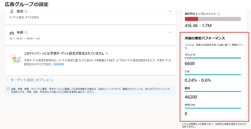 また、広告のグループ設定で月間の推定パフォーマンスを確認できるので、予算感や予測クリック数を確認しながらターゲティングの設定を行うとよいでしょう。