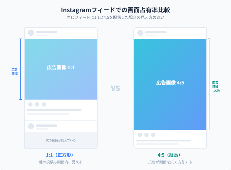 | 高(フィード重視) | 4:5 | 1080×1350px | フィード(Meta公式推奨、パフォーマンス向上) |