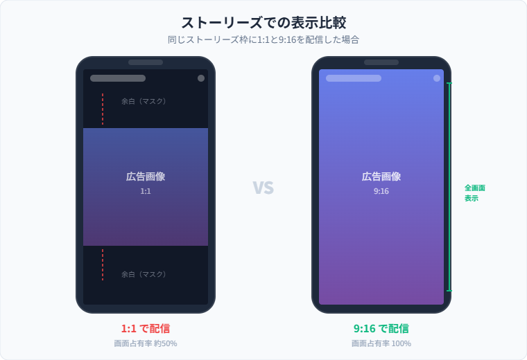 1:1の画像をストーリーズやリールに配信することも可能ですが、その場合は画面の上下に余白(マスク)が入り、視認面積が大きく損なわれます。1:1で代用したときの「見劣り感」は、フィードでの1:1→4:5の差よりもはるかに大きく、ユーザーの目にも明らかに広告然として映ります。