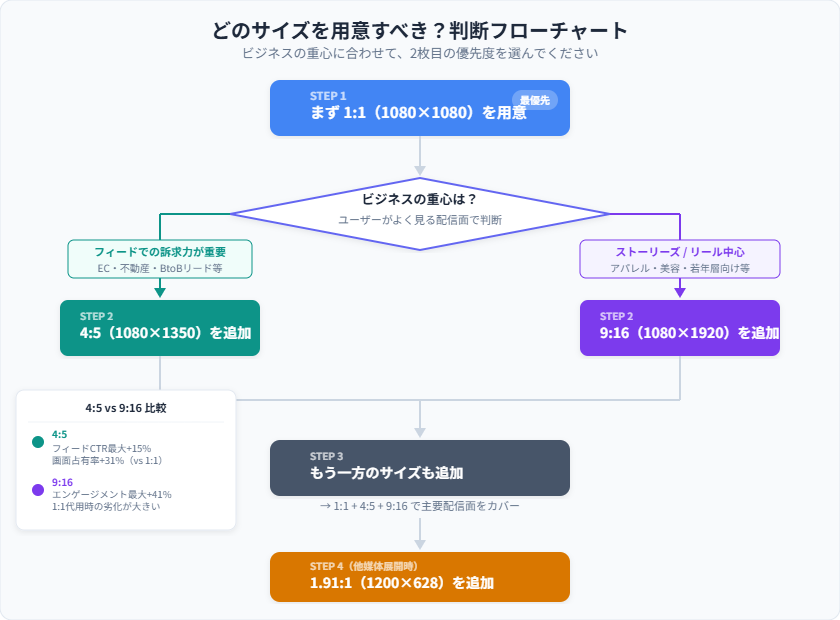 まず1:1を用意し、次にビジネスの重心に合わせて4:5か9:16を追加する。その後もう一方も揃え、他媒体との素材共通化を図りたければ1.91:1を加える。この考え方で進めれば、限られたリソースのなかでも自社に合った形でクリエイティブを揃えられます。