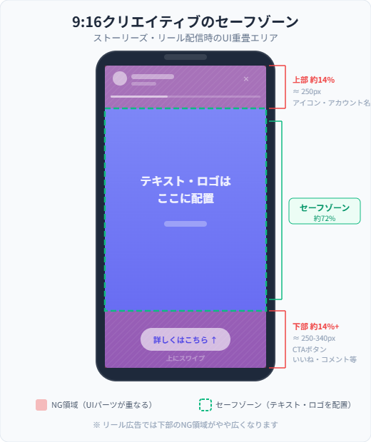 サイズを正しく用意しても、表示時にUIパーツと被ってしまっては意味がありません。特にストーリーズとリールの9:16クリエイティブでは、画面の上部にアカウントアイコン、下部にCTAボタンやいいねボタンが重なって表示されます。