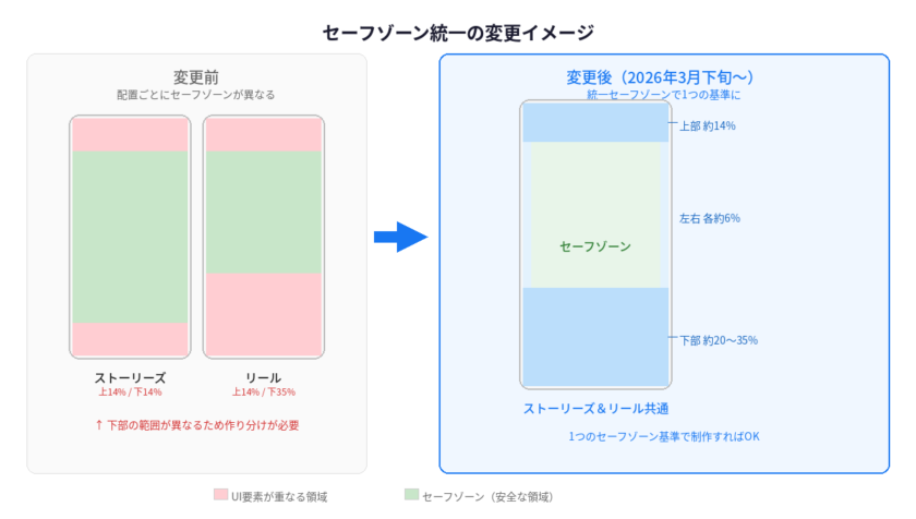 Meta公式ヘルプの記載によると、2026年3月下旬からはFacebook/Instagramのストーリーズとリールで同一のセーフゾーンが適用されます。セーフゾーンの仕様としては1つの基準で制作できるようになります。