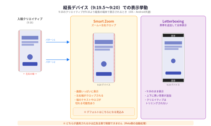 ここで重要なのは、どちらの処理が適用されるかを広告主側で制御する手段が現時点では提供されていないという点です。サードパーティの解説記事では、Smart Zoom(ズーム+左右クロップ)がデフォルトになる方向性が示唆されていますが、Meta公式からの明確な仕様説明は確認できていません。