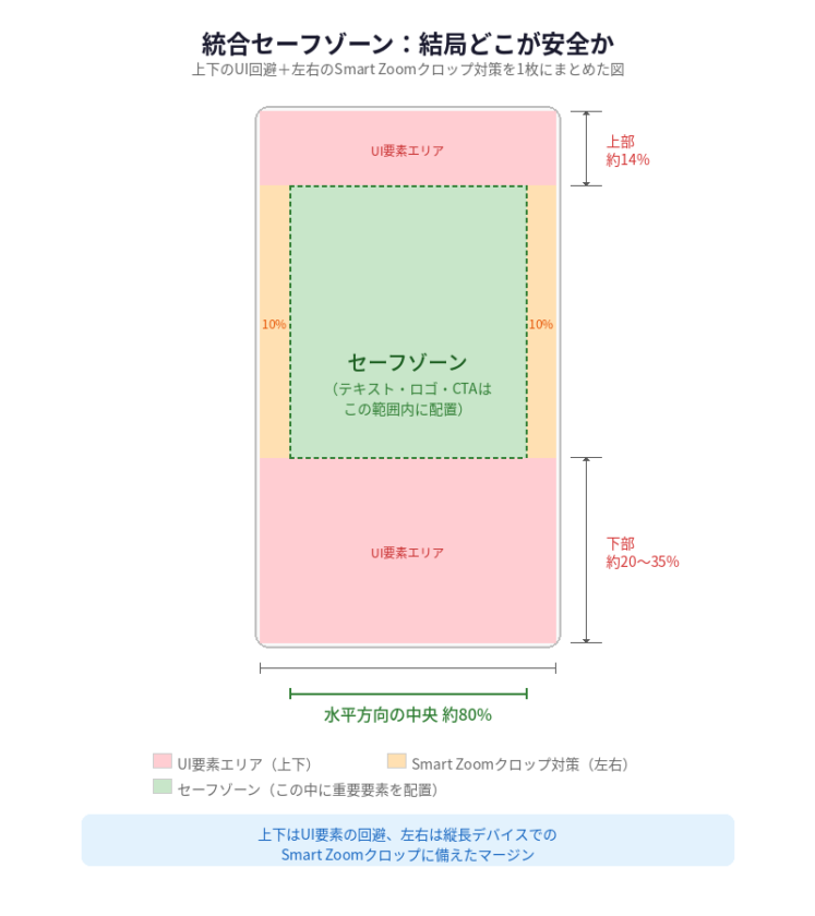 統一後のセーフゾーンは、1080×1920ピクセル(9:16)のキャンバスを基準に、以下の領域を避けるよう設計されています。