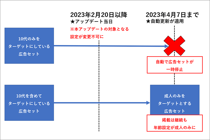 2023年4月7日までに、本アップデートの対象となる設定の変更を行わないと、10代のみターゲットにしている場合は広告セットが一時停止します。10代を含めてターゲットにしている場合は、年齢設定が成人のみに自動で移行されます。