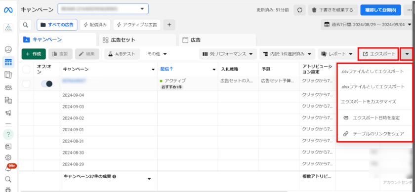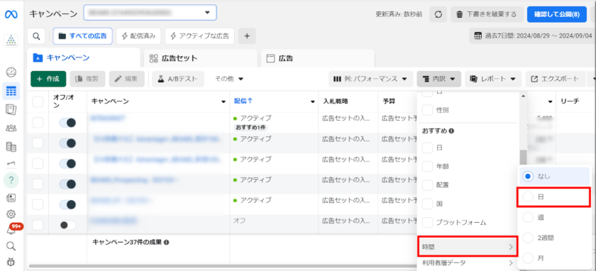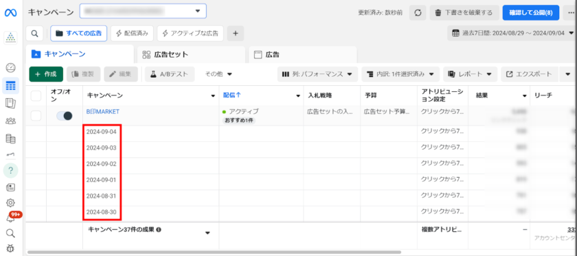 内訳は「キャンペーン」「広告セット」「広告」別に確認可能です。今回は例として「キャンペーン」ごとに、「過去7日間の日別実績」を確認していきましょう。