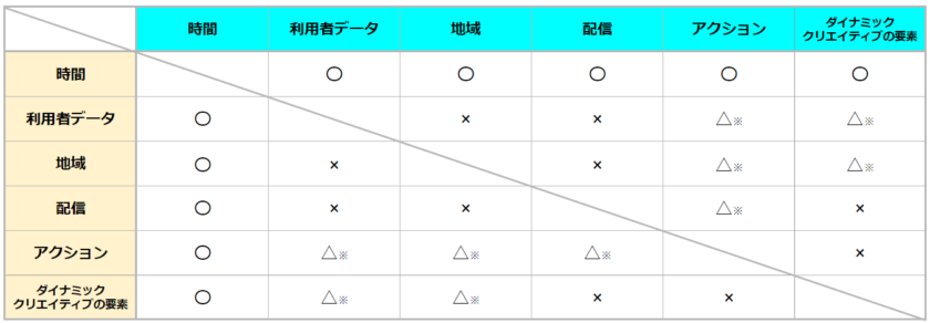 組み合わせられる項目は基本2つまでで、同じカテゴリ内の項目は組み合わせできません。ただし、例外もあります。「時間カテゴリ」と「利用者データカテゴリ」と「アクションカテゴリ」の一部項目(カルーセルカード、リンク先、ブランド、カテゴリ、動画再生タイプ)は最大3つまで組み合わせ可能です。
