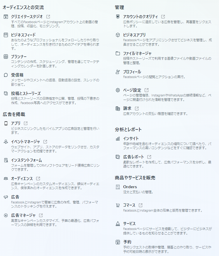 ほかにも、Meta Business Suiteにはたくさんの機能が備わっています。下記は、Meta Business Suiteで管理可能なビジネスアセットです。