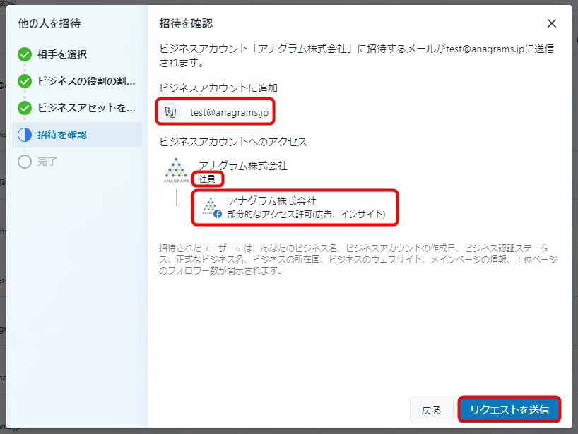 ⑧先ほど設定した内容(メールアドレス、役割、ビジネスアセット、アクセス許可)に間違いがないことを確認して「リクエストを送信」をクリックします。