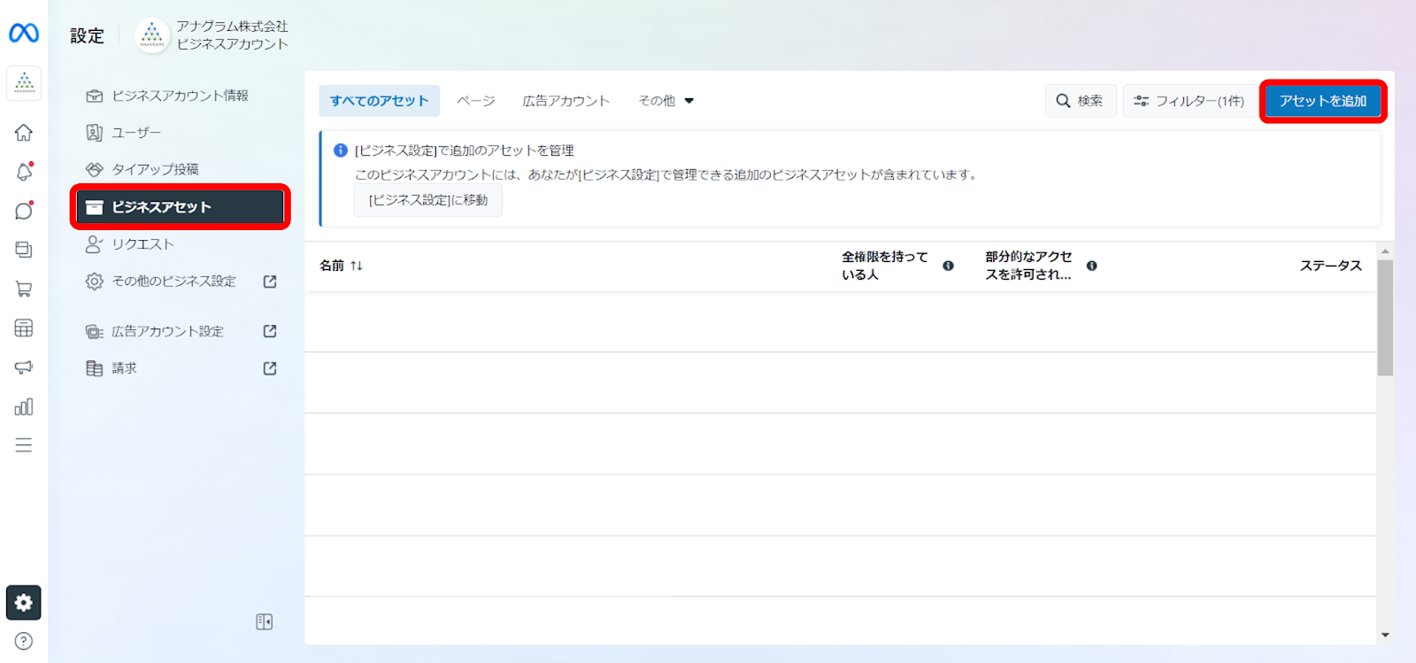 ※ビジネスアセットとは、Facebookページや広告アカウント、カタログなどのMeta Business Suite経由でアクセス可能なMeta社のツールのことです。
