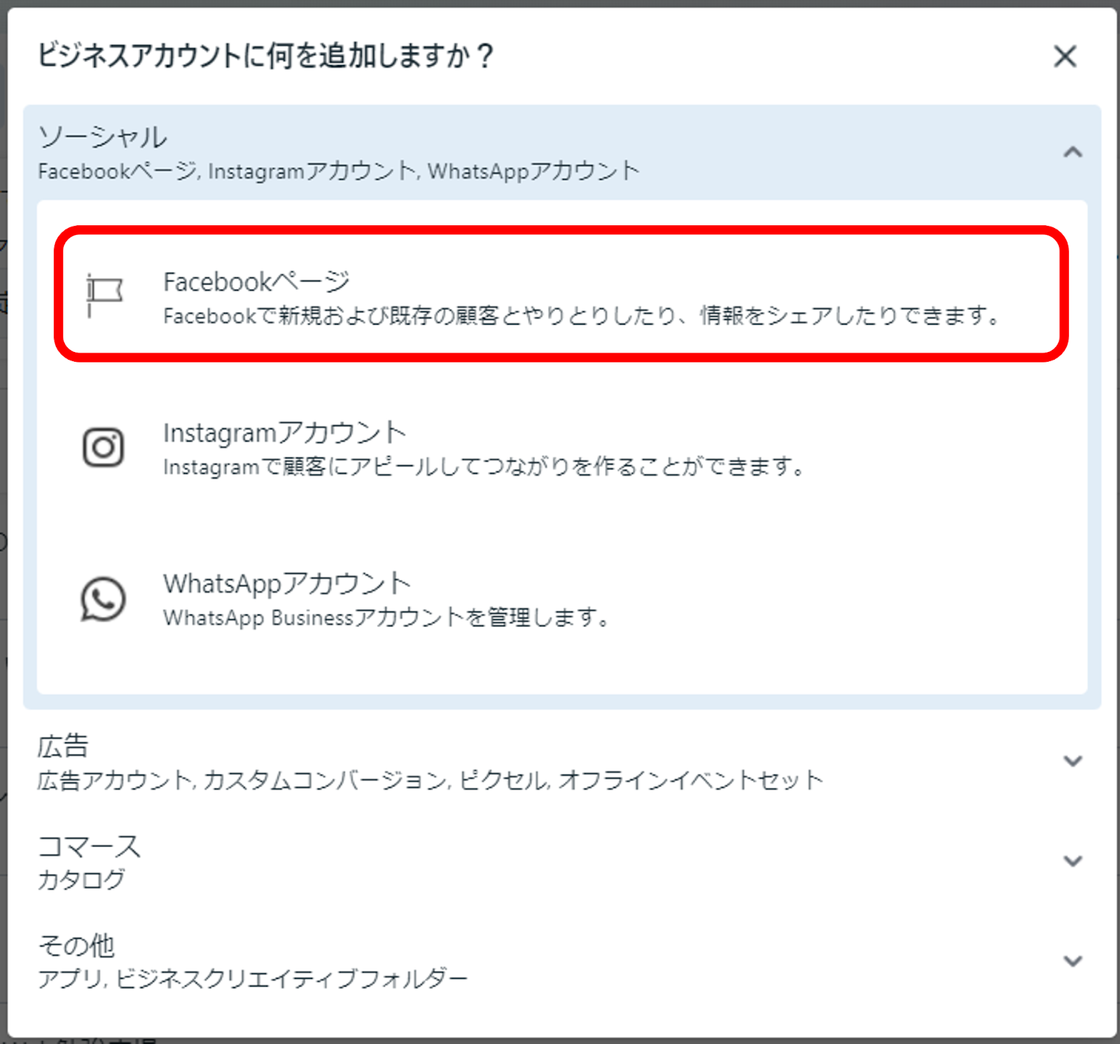④「Facebookページ」を選択します。