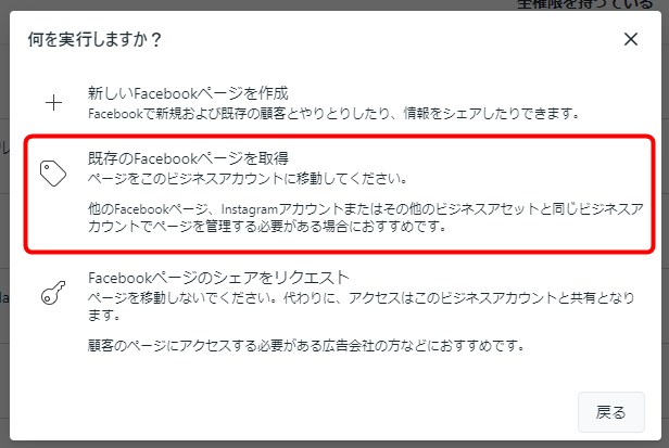 ⑤「既存のFacebookページを取得」をクリックします。