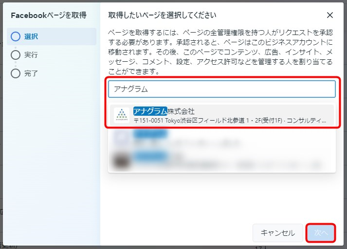 ⑥新たに追加したい自社のFacebookページ名、またはページURLを入力します。Facebookページの候補が表示されるので該当のFacebookページを選択して「次へ」をクリックします。