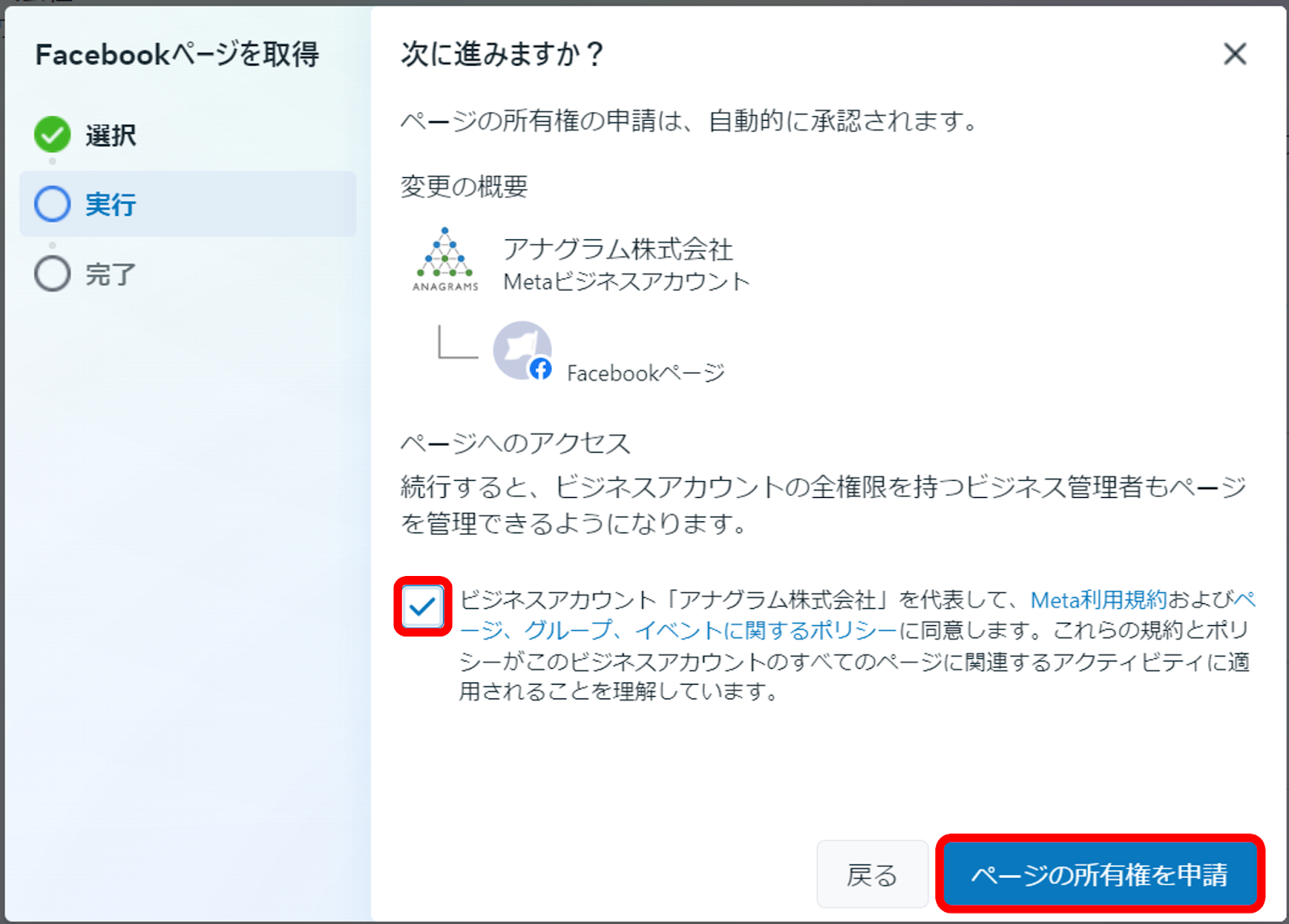 ⑦Meta利用規約およびページ、グループ、イベントに関するポリシーの同意にチェックを入れて許諾し、「ページの所有権を申請」をクリックでFaebookページの連携ができました。