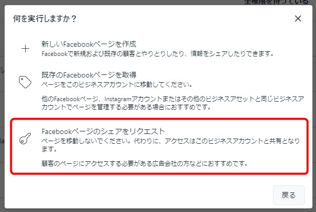 ⑤「Facebookページのシェアをリクエスト」をクリックします。