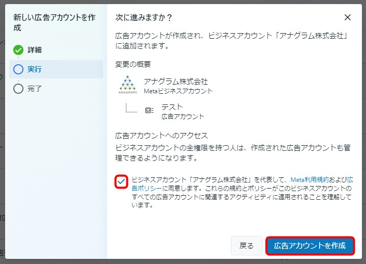 ⑦Meta利用規約および広告ポリシーの同意にチェックを入れて許諾し、「広告アカウントを作成」をクリックします。